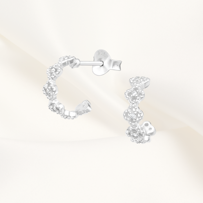 Cerceii Aurora din argint 925 sunt o alegere inspirată pentru femeile care preferă eleganța discretă și designul modern. Cu o formă half hoop (jumătate de cerc), aceștia oferă un aspect echilibrat și rafinat, potrivit atât pentru ținutele de zi, cât și pentru cele de seară.
